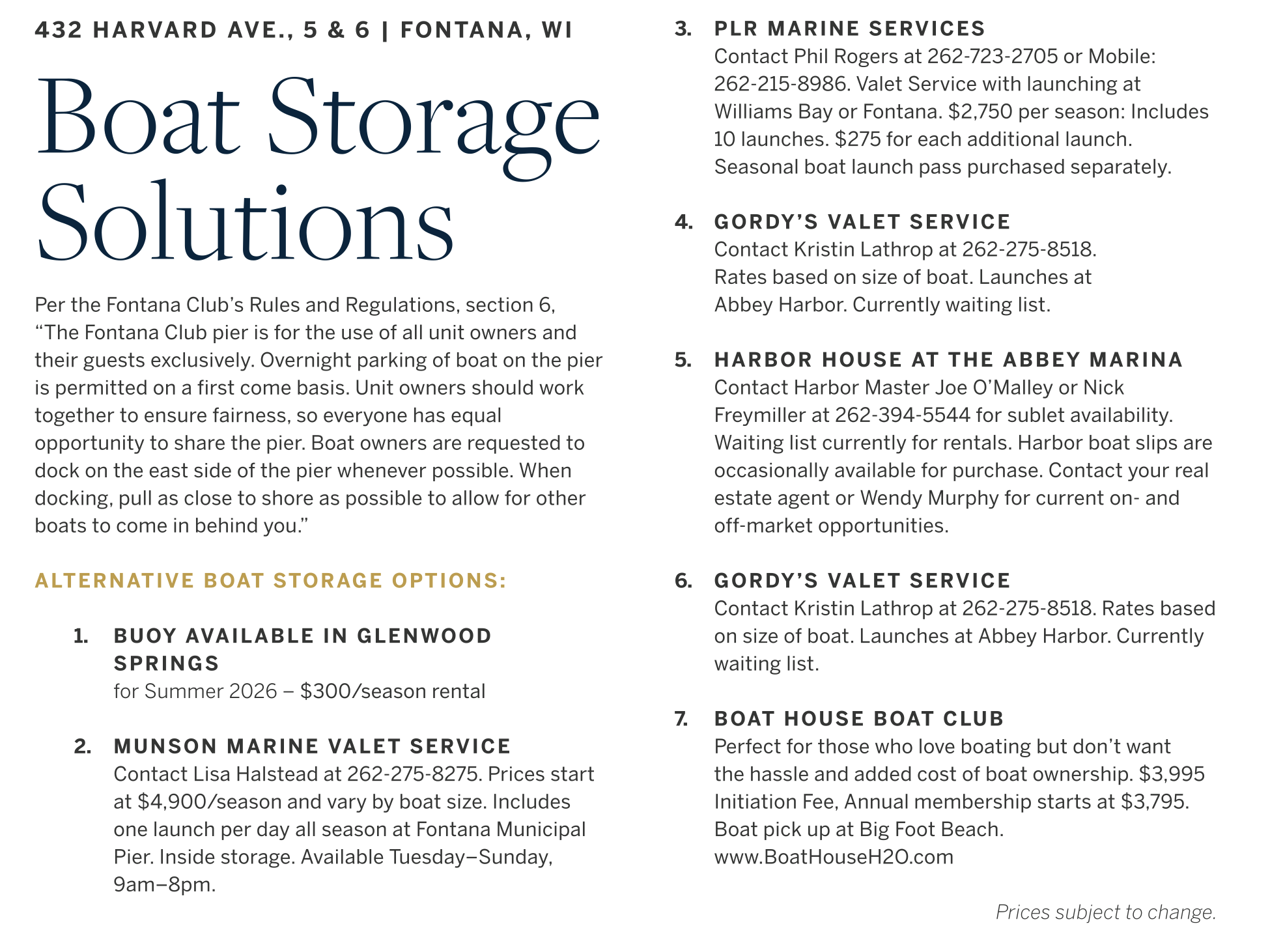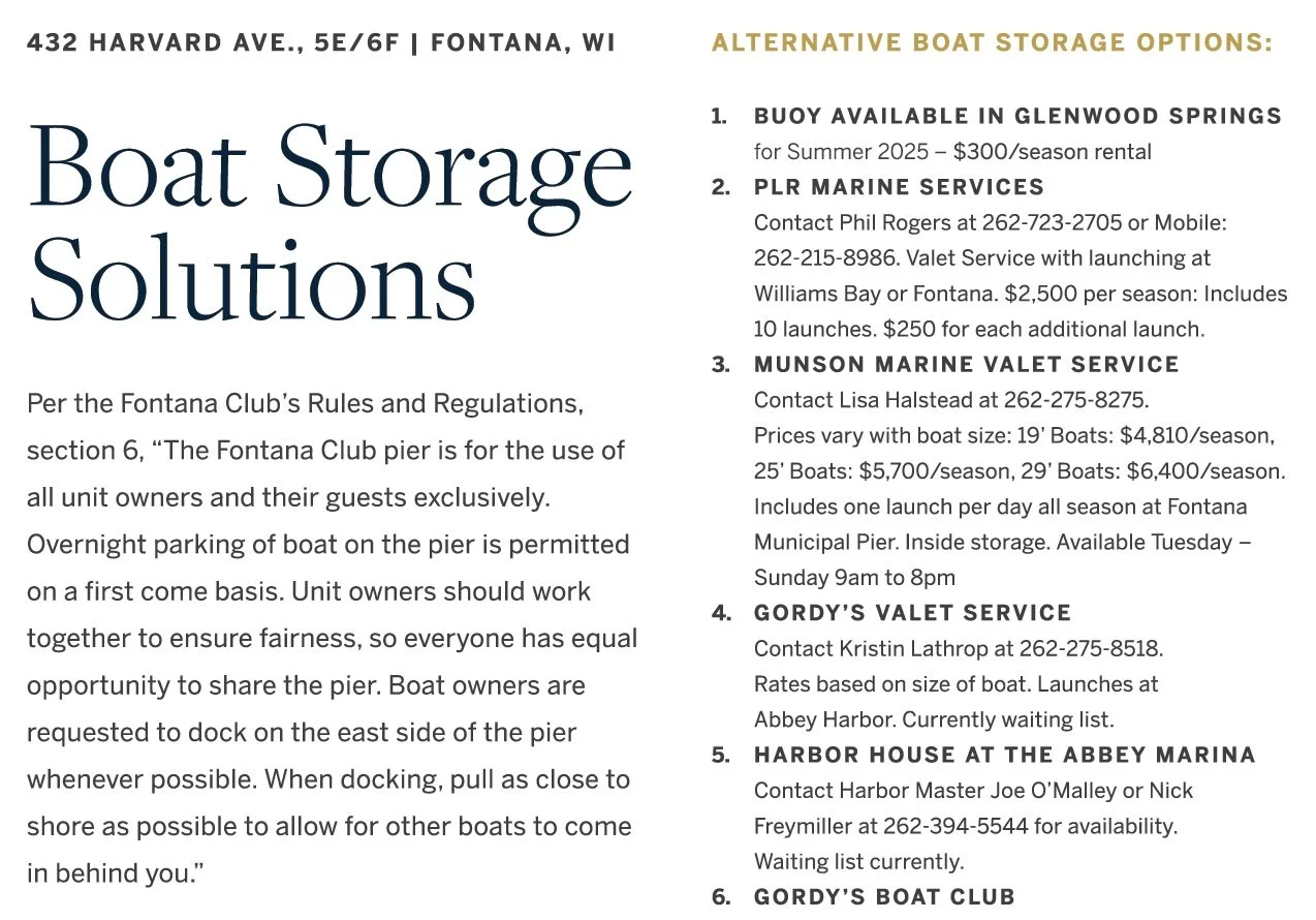 Fontana Club amenities include private lakefront patio with grilling stations, outdoor seating area, large fire pit, storage locker, private parking area for owners and guests, private association pier for overnight parking, to be arranged with other unit owners. Glenwood Springs amenities include two swim piers, community gathering pier, buoys for immediate use ($300 per season) and special events throughout the year.